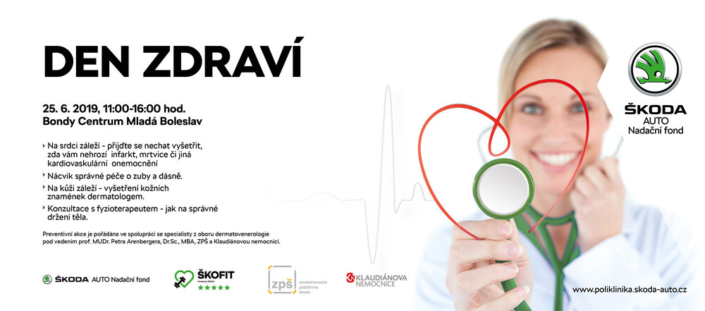 Nadační fond ŠKODA AUTO v rámci programu Nové Boleslavsko připravil pro širokou veřejnost Den zdraví, který se uskuteční v obchodním centru Bondy v úterý 25. června 2019 od 11.00 – 16.00 hodin. Akce se koná za podpory boleslavské Klaudiánovy nemocnice a Zaměstnanecké pojišťovny Škoda.- Hlavním tématem akce je prevence onemocnění srdce a cév s podtitulem „Na srdci záleží“. Zájemci si budou moci nechat změřit hladinu cholesterolu a cukru v krvi, změřit krevní tlak nebo zjistit přítomnost dalších rizikových faktorů a výsledky následně prokonzultovat s lékařem. Případné dotazy bude připraven zodpovědět odborník na správnou výživu a zdravý životní styl. V rámci prevence vzniku rakoviny kůže pod názvem „Na kůži záleží“ si bude možné nechat na místě vyšetřit kožní znaménka zkušeným dermatologem. Chybět nebude i program zaměřený na ústní hygienu. Odborníci na ústní hygienu ukáží jak a čím správně pečovat o zuby a dásně. Přítomný fyzioterapeut zase poradí, jak na správné držení těla.