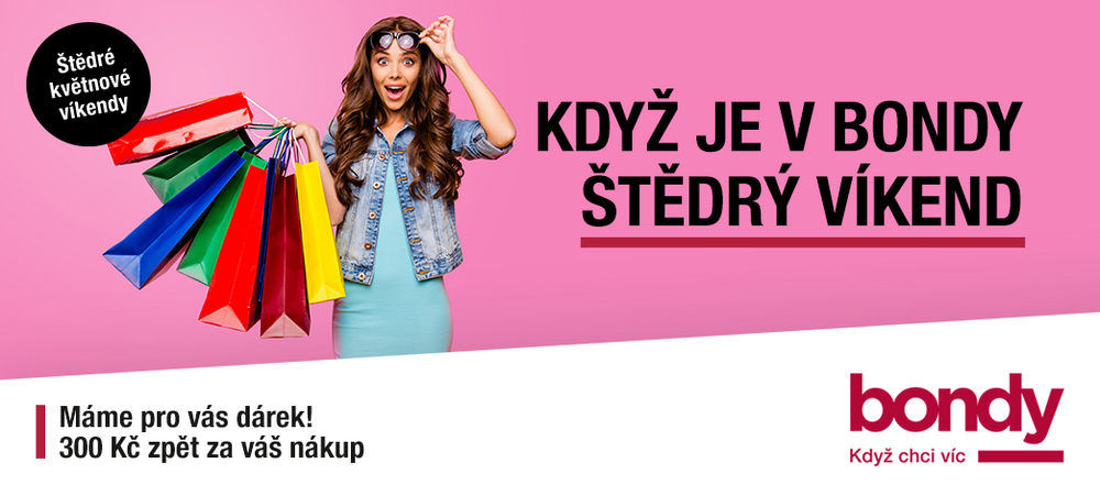 Máme pro vás dárek za váš nákup. Nakupte o květnových víkendech v Bondy Centru v hodnotě nad 1500 Kč (mimo Billa) a přijďte si k naší hostesce na náměstíčko v přízemí pro dárkovou Bondy kartu nabitou na 300 Kč. Nabitou kartu můžete darovat nebo využít ve většině našich obchodů. Více o dárkových kartách zde.