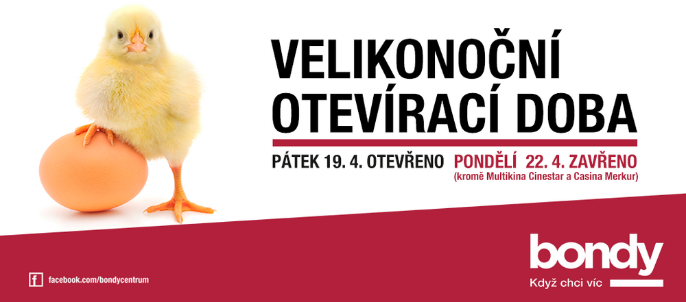 Pomlázku a barvení vajíček si pak v klidu užijte na Velikonoční pondělí. Obchody v Bondy budou zavřené. Pokud si však chcete užít třeba nějaký pěkný film, tak neváhejte vyrazit do Multikina Cinestar. V kině a casinu platí běžná otevírací doba.