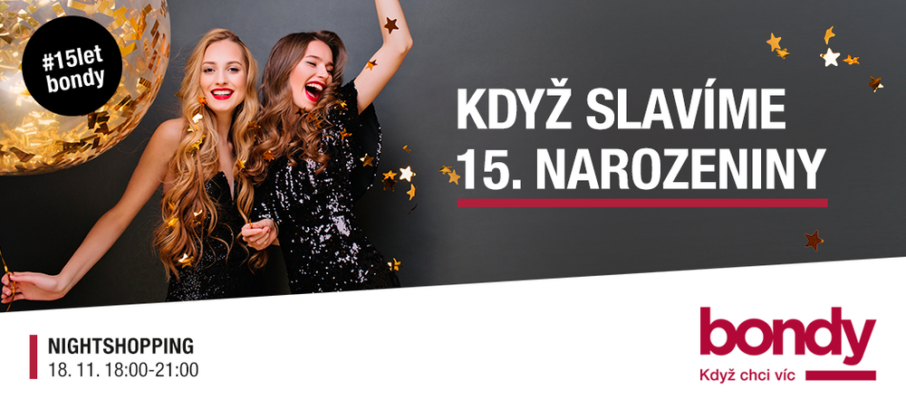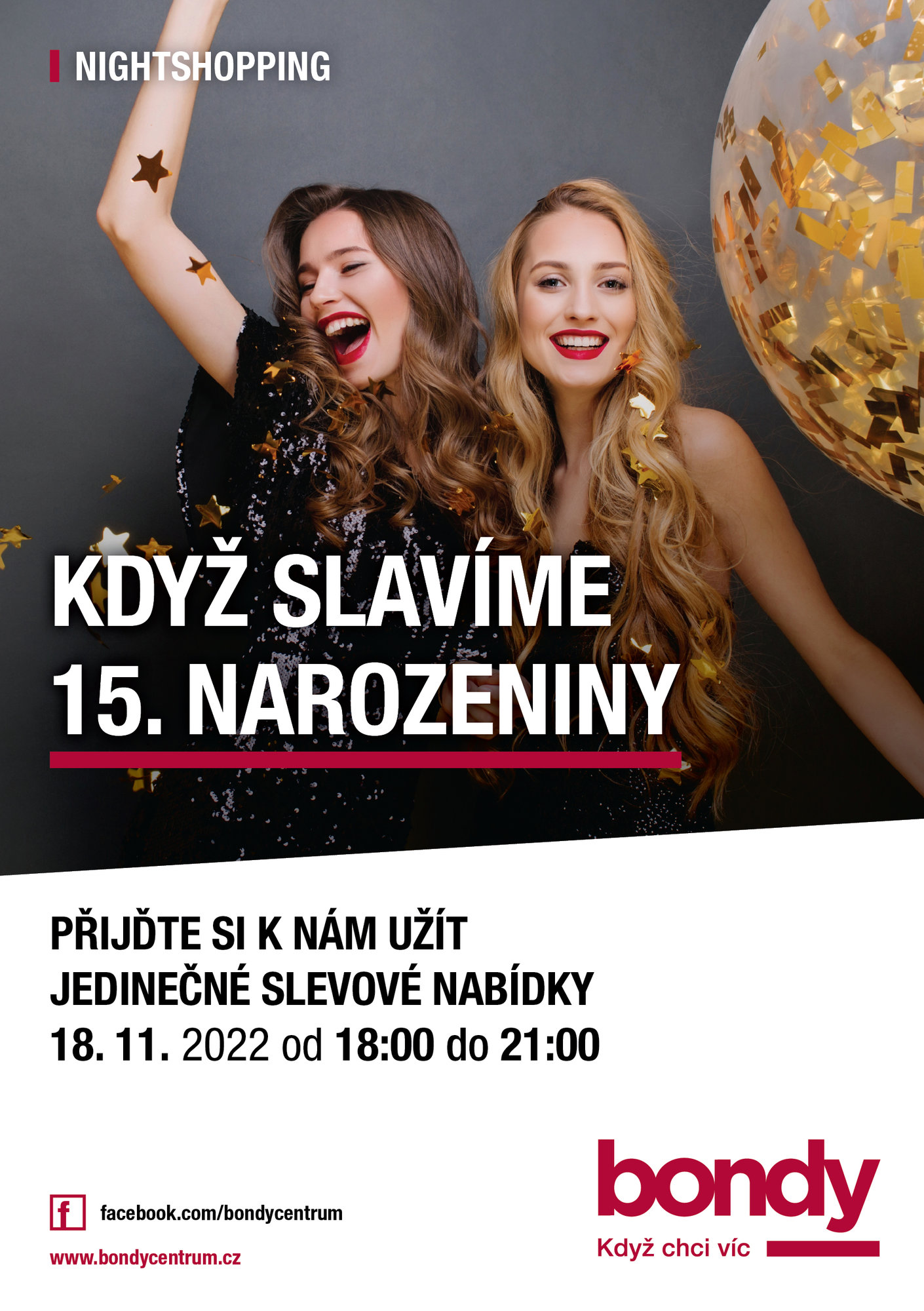 Skvělá party v Bondy se blíží. Přijďte s námi oslavit 15. narozeniny. V pátek 18.11. od 18:00 do 21:00 proběhne tradiční Nightshopping.