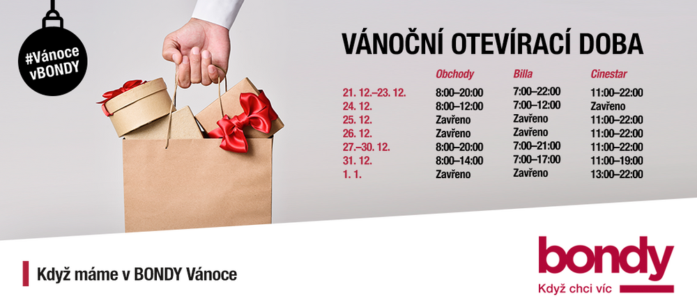 Vážení zákazníci, během Vánočních svátků je otevírací doba Bondy Centra upravena.