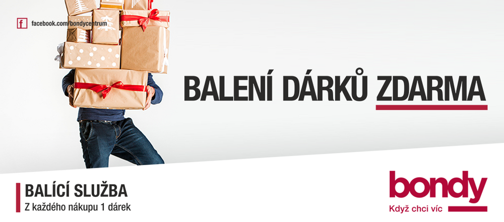 Vy nakoupíte, my zabalíme! Při předložení účtenky za nákup nad 500 Kč v Bondy vám rádi dárek zabalíme. Maximální rozměr archu je 100 x 70 cm. Užijte si Vánoce v Bondy. Stánek s balící službou najdete v přízemí.